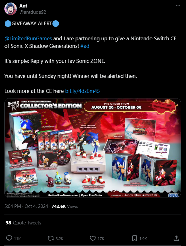 One of my duties at LRG has been coordinated PR and marketing between our partners and departments. For this release, I managed the marketing campaigns between SEGA of America and LRG for the highly anticipated Sonic x Shadow Generations Collector's Edition, culminating in a presentation from the official Sonic Channel that featured my writing and our team's product banners.