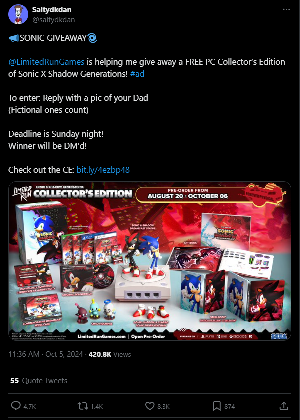 While writing the copy for advertisements + paid and organic social, I also had the pleasure of leading two high-engagement influencer campaigns with Saltydkdan and AntDude. This giveaway established a core rule for me: Influencers know their audiences, and it's important to let them play into them (as long as rightsholders sign off on it).